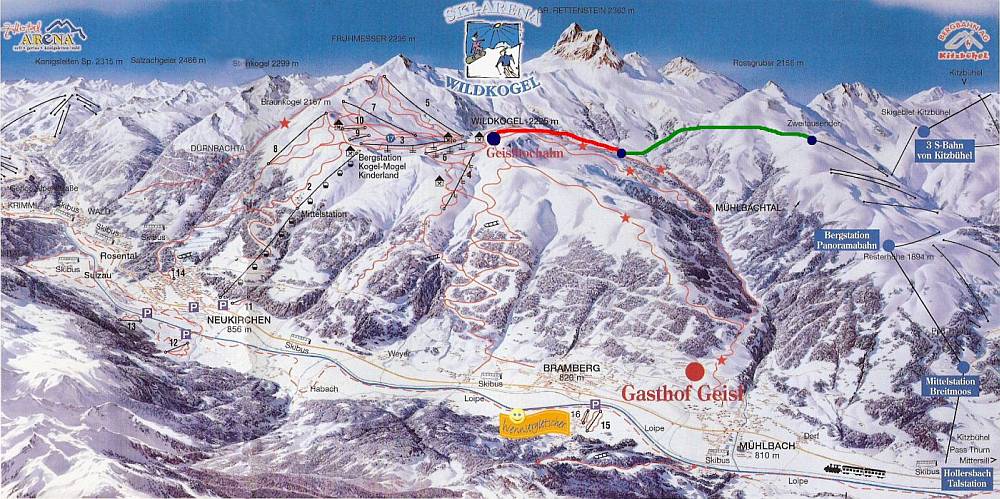 Blau eingezeichnet sehen Sie die Tiefschnee-Abfahrt von der Geisl Hochalm zur Geisl Grundalm. Auch eine Abfahrt vom Kitzbüheler Skigebiet ist möglich (grün eingezeichnet).